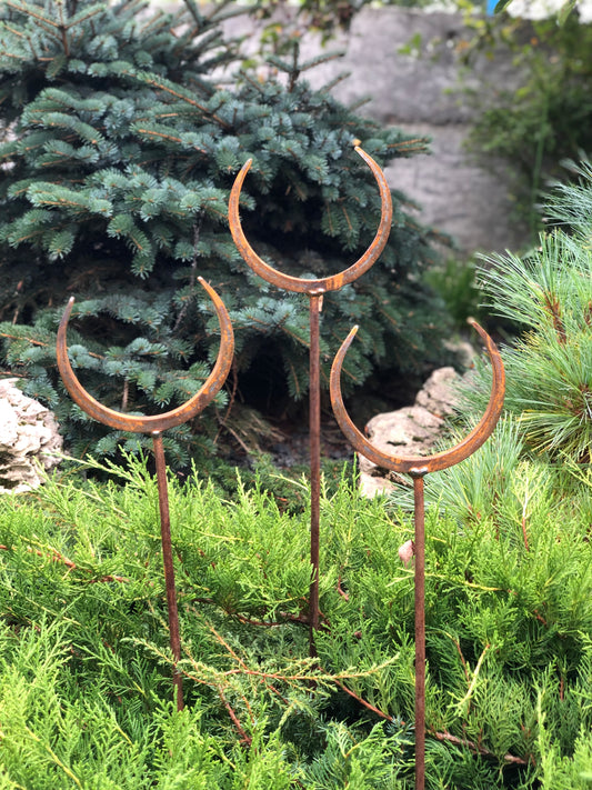 Set of 3 Rusty Metal garden stakes, Rusty garden finials, Metal garden decor, metal yard art, outdoor metal decor, Rusty metal ring decor