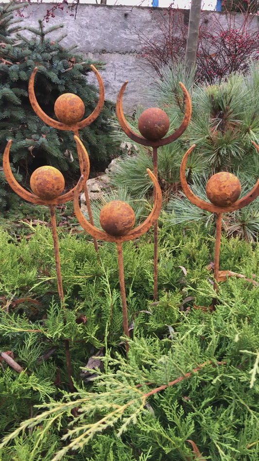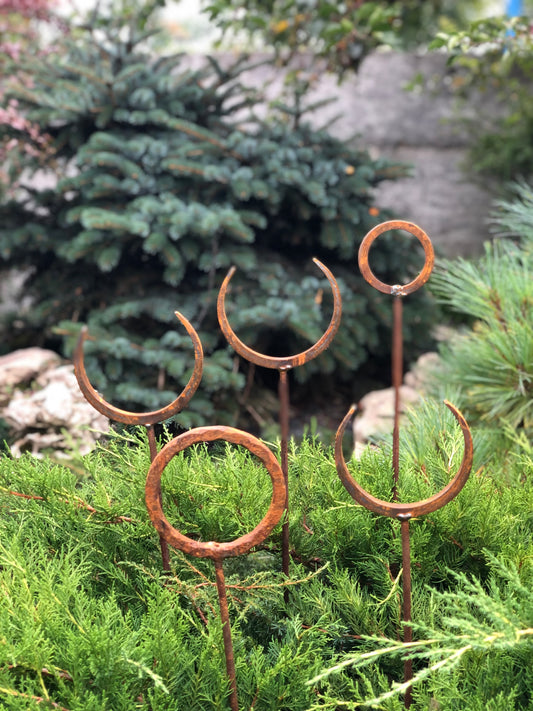 Set of 5 Rusty Metal garden stakes, Rusty garden finials, Metal garden decor, metal yard art, outdoor metal decor, Rusty metal ring decor