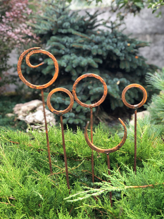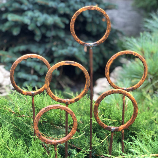 Set of 5 Rusty Metal garden stakes, Rusty garden finials, Metal garden decor, metal yard art, outdoor metal decor, Rusty metal ring decor