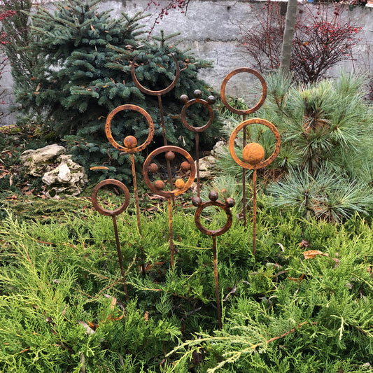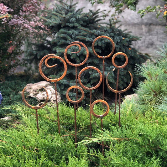 Set of 9 Rusty Metal garden stakes, Rusty metal ring decor