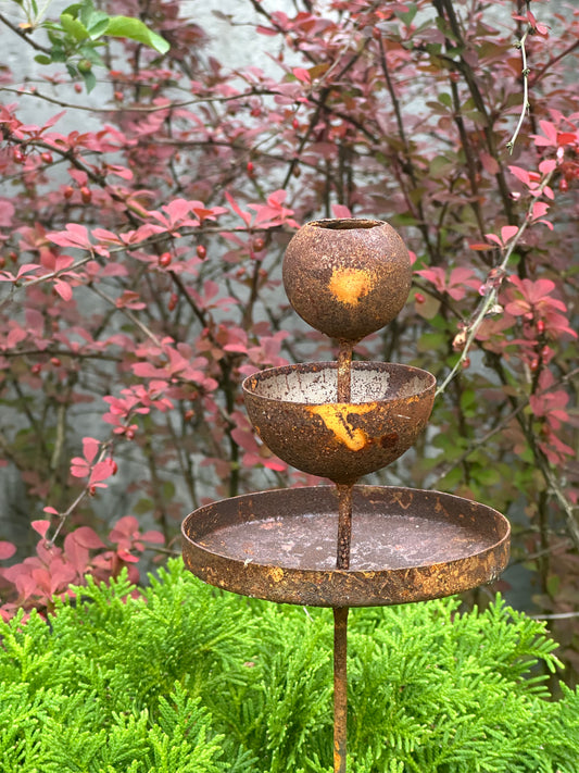 Metal rain catchers, 8” Rusty metal flower garden stakes, Bird bath outdoor garden decor